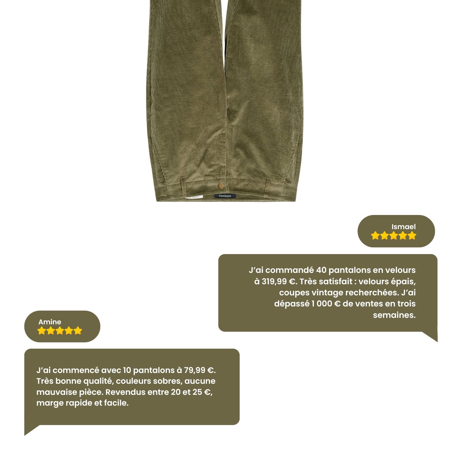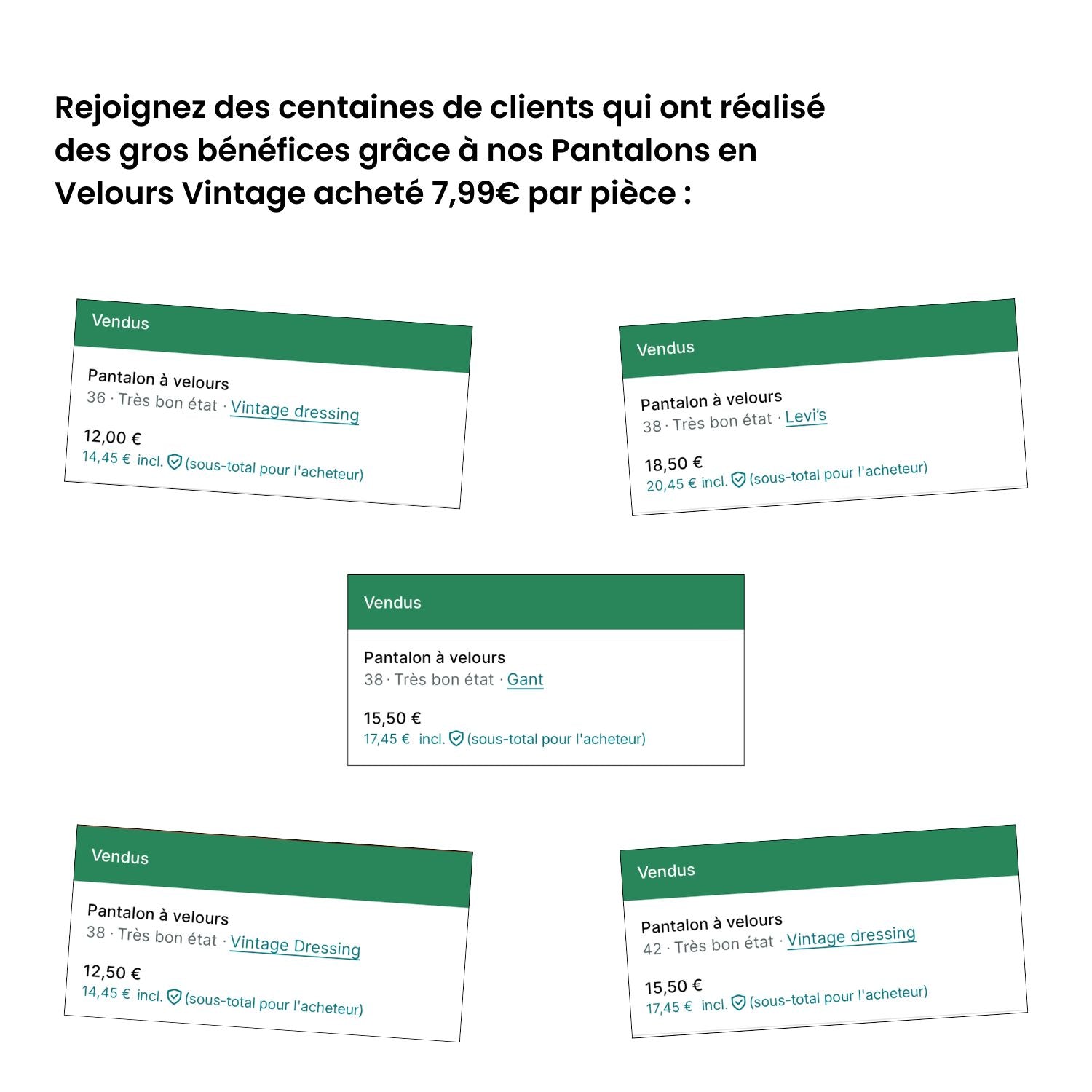 C’est un véritable levier pour lever les hésitations liées au budget et vous permettre d’investir sereinement dans votre stock. Découvrez les résultats de nos clients ayant revendu des Pantalons en Velours Vintage