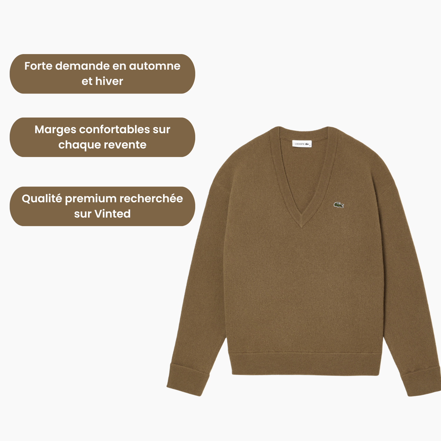 Les Pulls de Marques sont recherchés en achat-revente pour leur usage saisonnier et leur présence constante en seconde main. Adaptés à la revente en ligne comme en boutique physique. Prix de revente observé, minimum 25 € à 45 € par unité. Catégorie simple à positionner, favorisant une rotation régulière du stock. Découvrez les résultats de nos clients ayant revendu des Pulls de Marques