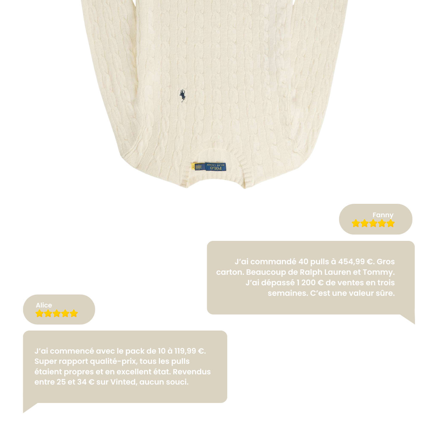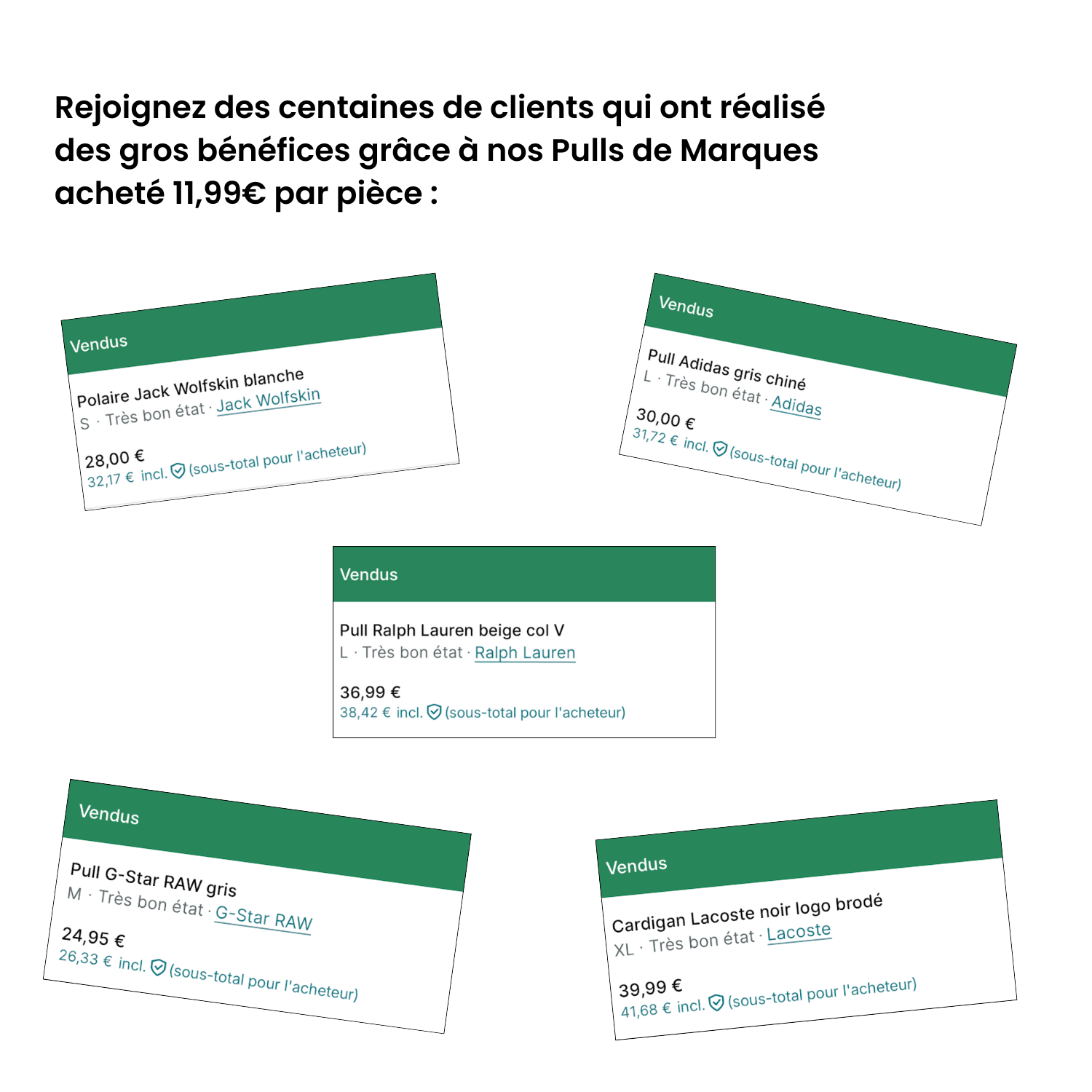 C’est un véritable levier pour lever les hésitations liées au budget et vous permettre d’investir sereinement dans votre stock. Découvrez les résultats de nos clients ayant revendu des Pulls de Marques